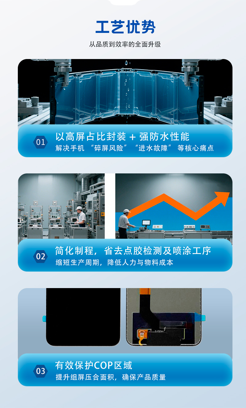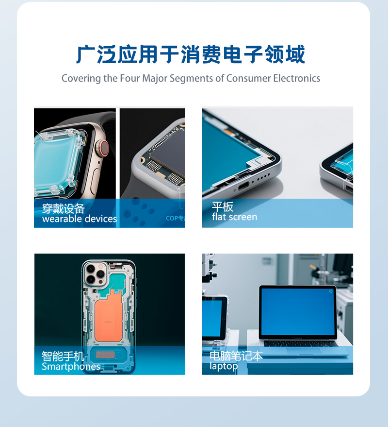 專為手機、穿戴設備、平板電腦及筆記本等消費電子領域打造,以真空環境灌膠成型技術,實現顯示模組的完美封裝...