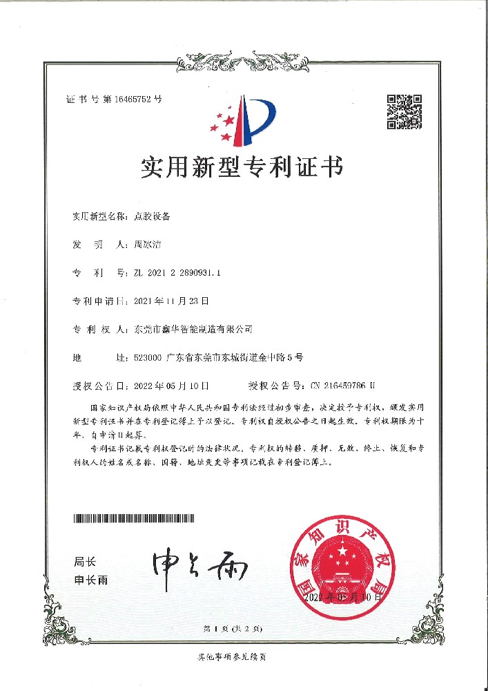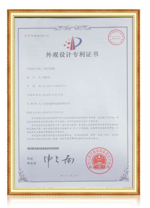 五軸點膠機專利證書