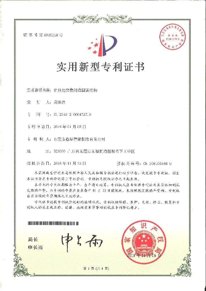 治具定位槽圓弧結構證書