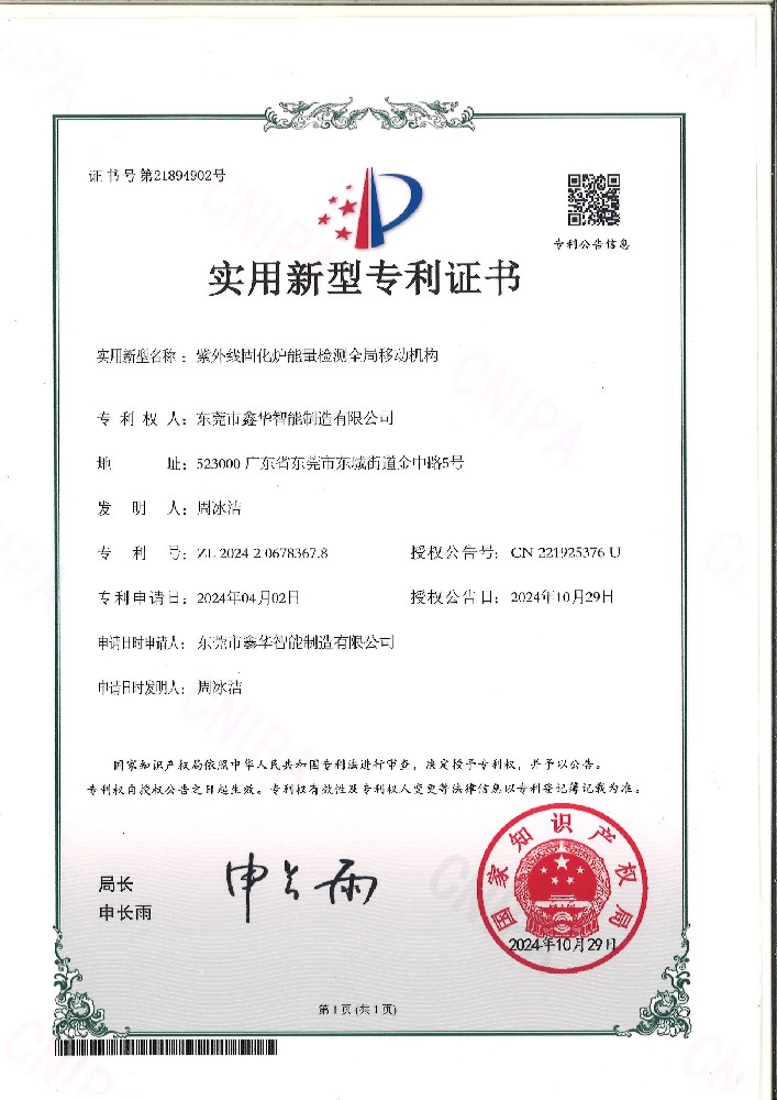 紫外光固化爐能量檢測全局移動機構證書